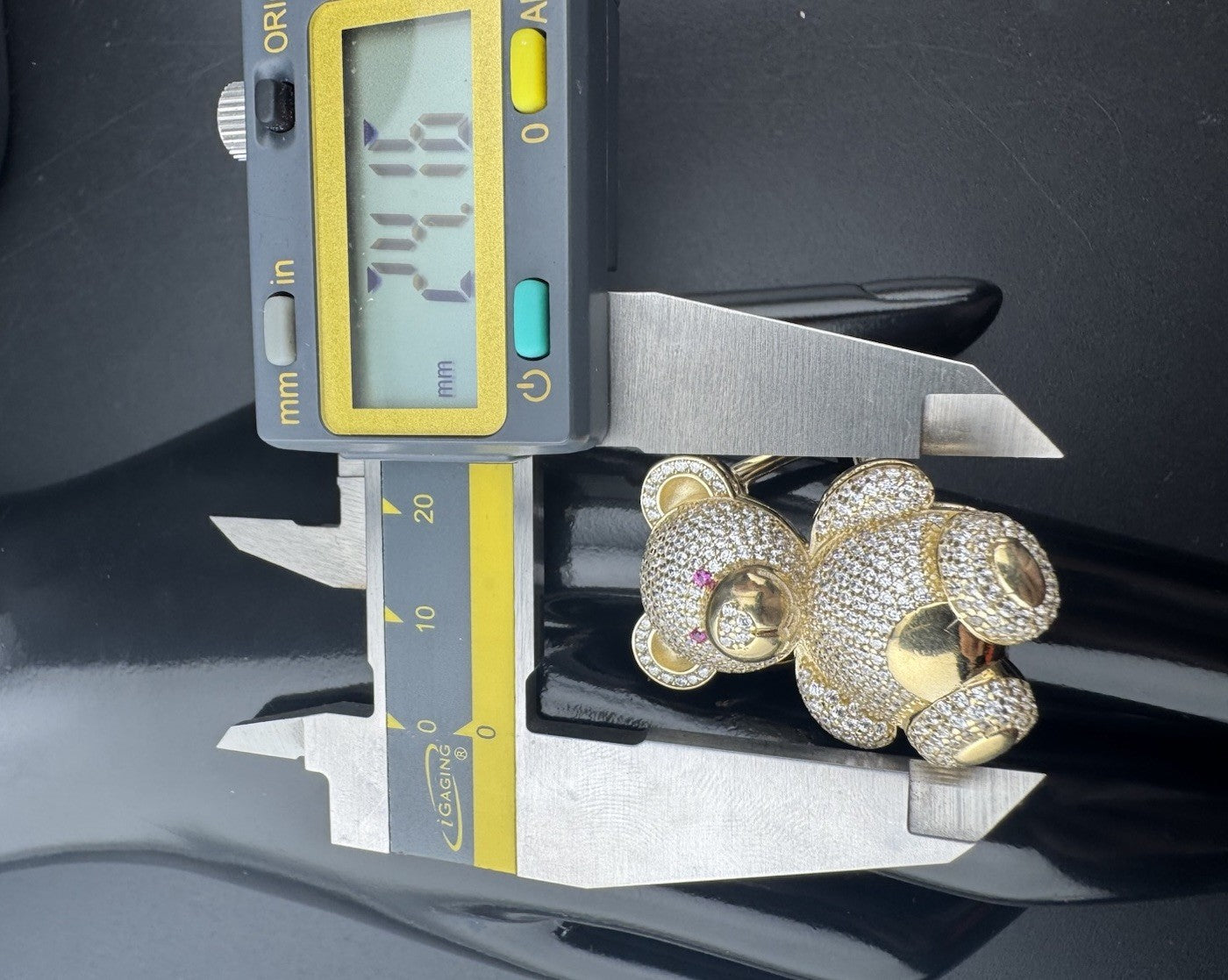 Adorn your hand with whimsical luxury in this 14K yellow gold Beltran Jewelry teddy bear ring. Crafted in ring size 7.25, the teddy bear design measures 31.28mm x 24.16mm, offering a bold large-sized presence. Adorned with pave simulated diamonds across the bear’s body and featuring vibrant pink stone eyes, this ring combines playful charm with sophisticated sparkle. Perfect for collectors, gift-givers, or those who love unique jewelry, it showcases Beltran’s signature craftsmanship. Ideal for everyday wear or special occasions, this ring is a true statement piece. See photos for exact measurements and details!