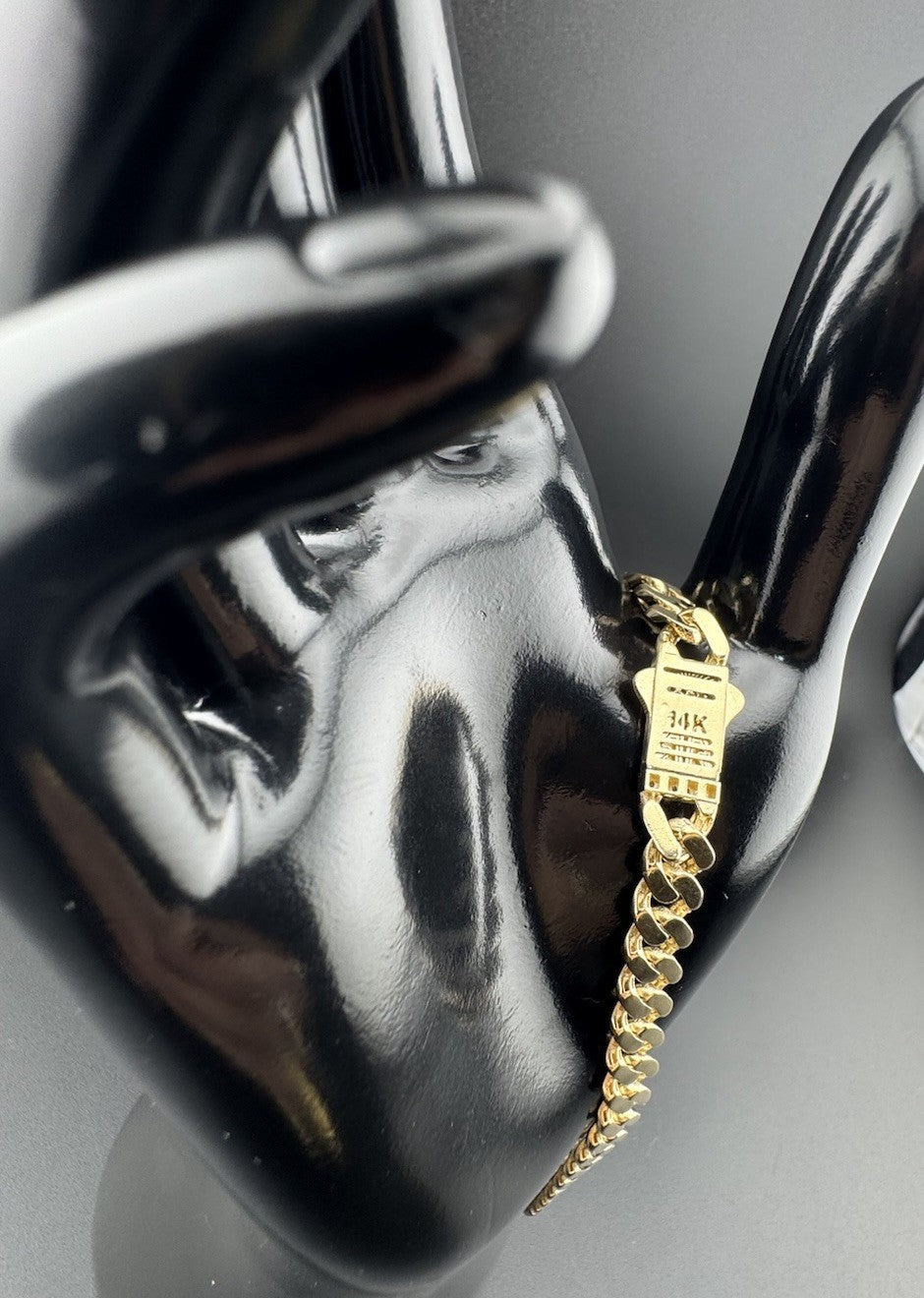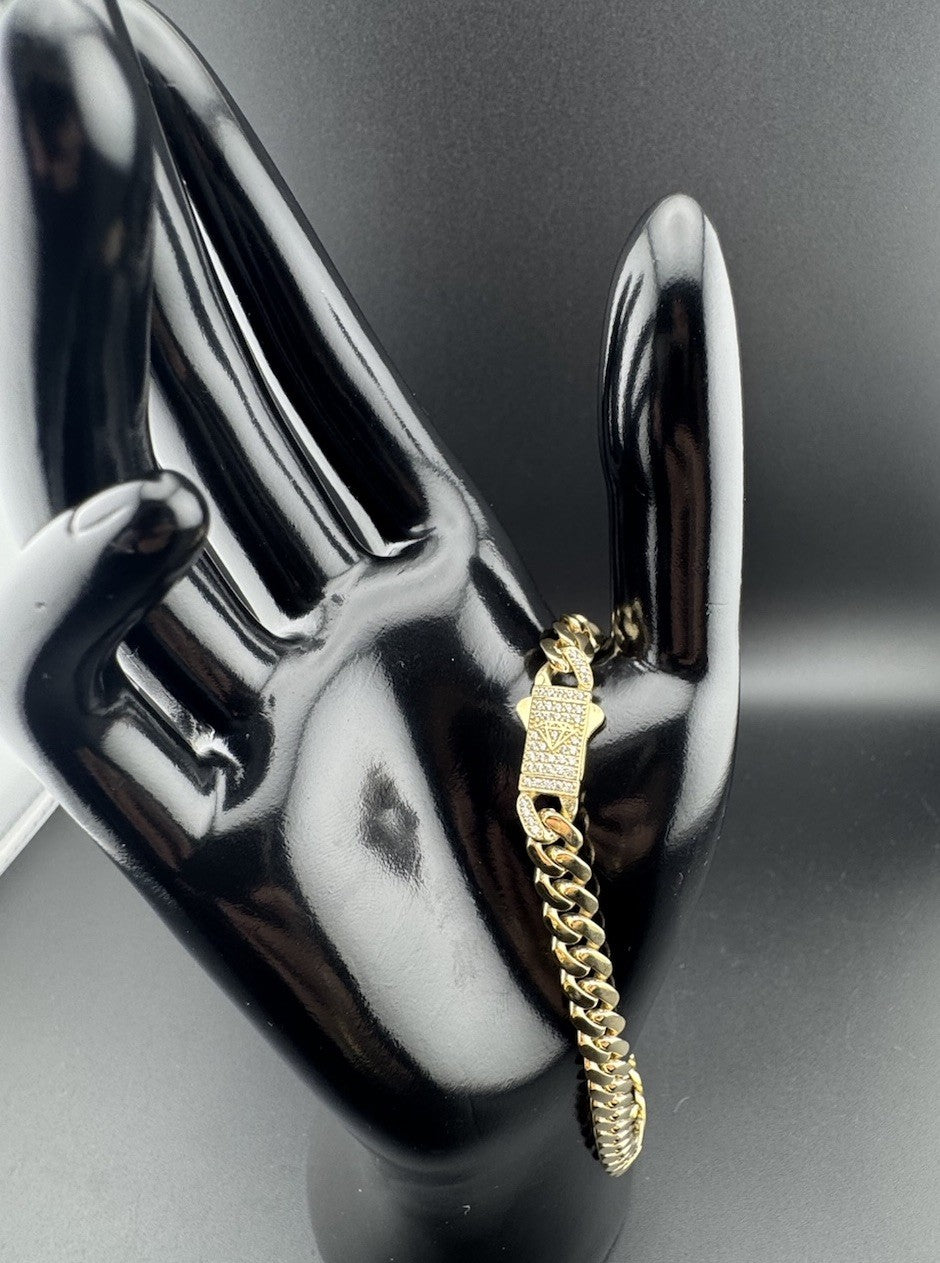 Step up your style with this 14K yellow gold Miami Cuban link anklet. Measuring 10 inches long and 7.22mm wide, this anklet weighs approximately 12 grams, delivering a bold yet comfortable design. Featuring a striking emblem bail push lock adorned with sparkling cubic zirconia simulated diamonds, the iconic Cuban link pattern exudes luxury and sophistication. Perfect for adding flair to casual or beach looks, this anklet is a must-have for those who love statement jewelry or as a unique gift. Crafted with precision, it combines timeless elegance with modern charm. See photos for exact measurements and details!