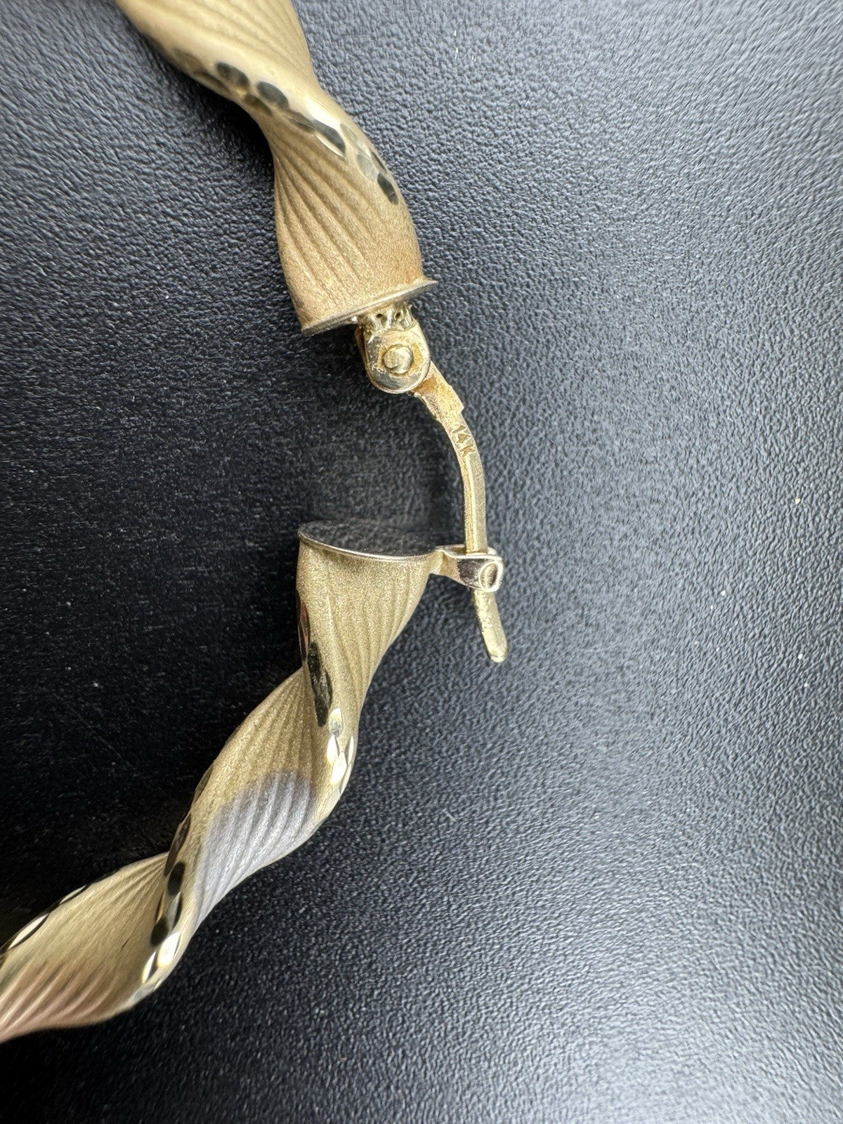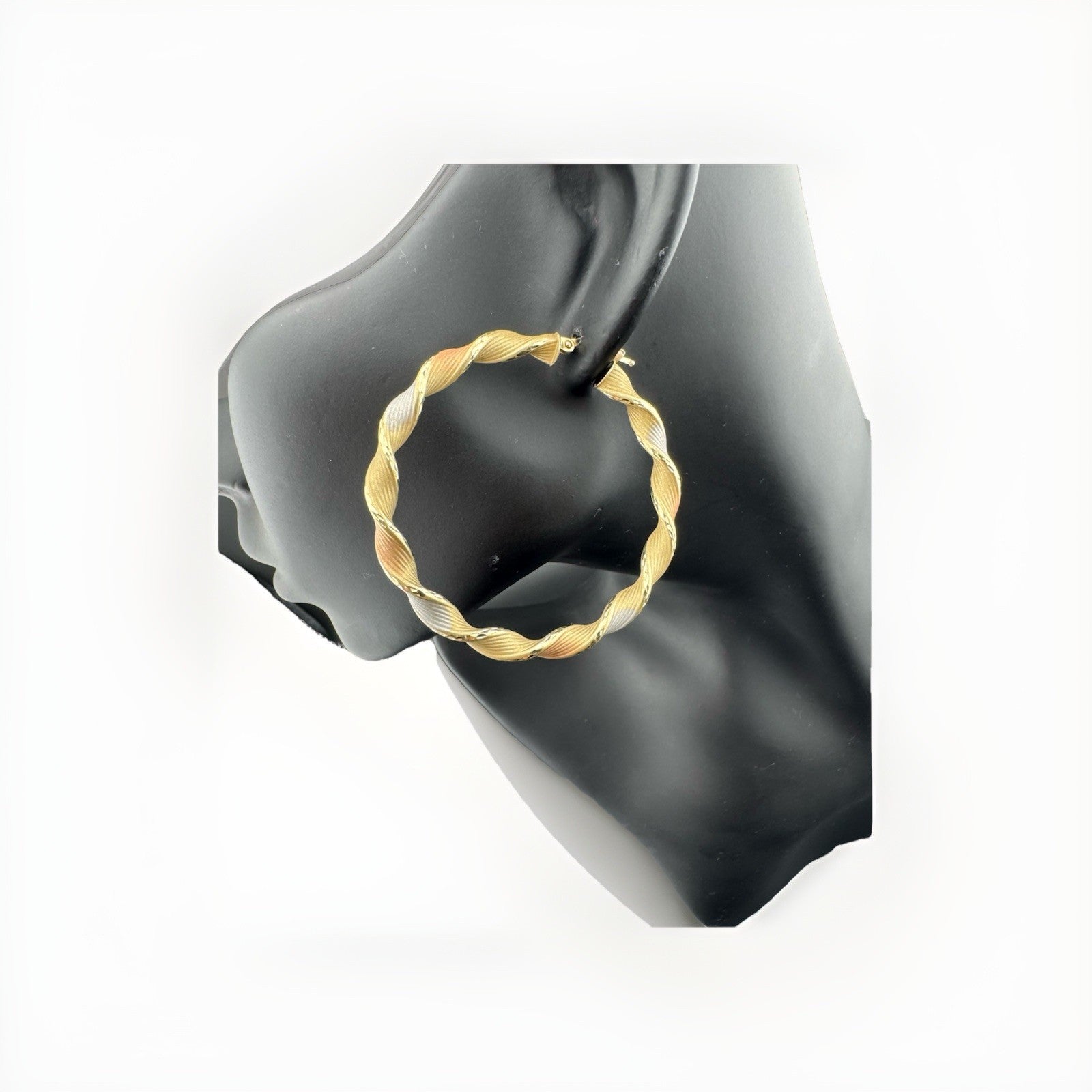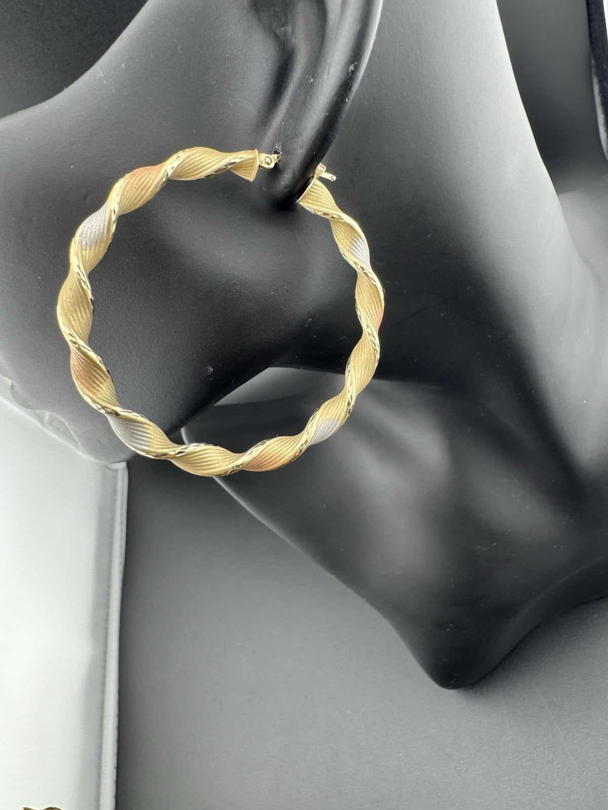 14K tri-tone gold twist hoop earrings are bold and rare—secure yours today before it’s gone!
